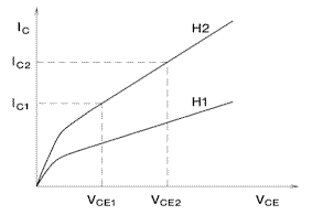For a constant base drive the curve shows a positive slope with increasing voltage. It is clear that the current gain at collector-emitter voltage VCE2 is greater than the current gain at VCE1. The current gain will also increase with increasing temperature.