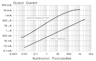 Unlike a photodiode whose output is linear with respect to incident light over 7 to 9 decades of light intensity, the collector current (IC) of a phototransistor is linear for only 3 to 4 decades of illumination. The prime reason for this limitation is that the dc gain (hFE) of the phototransistor is a function of collector current (IC) which in turn is determined by the base drive. The base drive may be in the form of a base drive current of incident light.