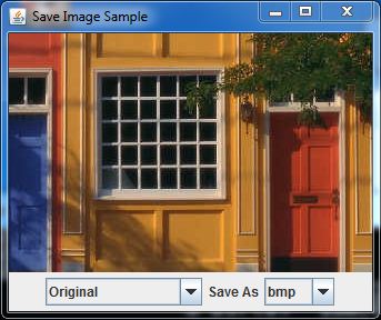 import java.io.*; import java.util.TreeSet; import java.awt.*; import java.awt.event.*; import java.awt.geom.AffineTransform; import java.awt.image.*; import javax.imageio.*; import javax.swing.*; public class SaveImage extends Component implements ActionListener { String descs[] = { "Original", "Convolve : LowPass", "Convolve : Sharpen", "LookupOp", }; int opIndex; private BufferedImage bi, biFiltered; int w, h; public static final float[] SHARPEN3x3 = { // sharpening filter kernel 0.f, -1.f, 0.f, -1.f, 5.f, -1.f, 0.f, -1.f, 0.f }; public static final float[] BLUR3x3 = { 0.1f, 0.1f, 0.1f, // low-pass filter kernel 0.1f, 0.2f, 0.1f, 0.1f, 0.1f, 0.1f }; public SaveImage(String filename) { try { bi = ImageIO.read(new File(filename)); w = bi.getWidth(null); h = bi.getHeight(null); if (bi.getType() != BufferedImage.TYPE_INT_RGB) { BufferedImage bi2 = new BufferedImage(w, h, BufferedImage.TYPE_INT_RGB); Graphics big = bi2.getGraphics(); big.drawImage(bi, 0, 0, null); biFiltered = bi = bi2; } } catch (IOException e) { System.out.println(filename + " not found"); System.exit(1); } } public Dimension getPreferredSize() { return new Dimension(w, h); } String[] getDescriptions() { return descs; } void setOpIndex(int i) { opIndex = i; } public void paint(Graphics g) { filterImage(); g.drawImage(biFiltered, 0, 0, null); } int lastOp; public void filterImage() { BufferedImageOp op = null; if (opIndex == lastOp) { return; } lastOp = opIndex; switch (opIndex) { case 0: biFiltered = bi; /* original */ return; case 1: /* low pass filter */ case 2: /* sharpen */ float[] data = (opIndex == 1) ? BLUR3x3 : SHARPEN3x3; op = new ConvolveOp(new Kernel(3, 3, data), ConvolveOp.EDGE_NO_OP, null); break; case 3 : /* lookup */ byte lut[] = new byte[256]; for (int j=0; j<256; j++) { lut[j] = (byte)(256-j); } ByteLookupTable blut = new ByteLookupTable(0, lut); op = new LookupOp(blut, null); break; } /* Rather than directly drawing the filtered image to the * destination, filter it into a new image first, then that * filtered image is ready for writing out or painting. */ biFiltered = new BufferedImage(w, h, BufferedImage.TYPE_INT_RGB); op.filter(bi, biFiltered); } /* Return the formats sorted alphabetically and in lower case */ public String[] getFormats() { String[] formats = ImageIO.getWriterFormatNames(); TreeSet<String> formatSet = new TreeSet<String>(); for (String s : formats) { formatSet.add(s.toLowerCase()); } return formatSet.toArray(new String[0]); } public void actionPerformed(ActionEvent e) { JComboBox cb = (JComboBox)e.getSource(); if (cb.getActionCommand().equals("SetFilter")) { setOpIndex(cb.getSelectedIndex()); repaint(); } else if (cb.getActionCommand().equals("Formats")) { /* Save the filtered image in the selected format. * The selected item will be the name of the format to use */ String format = (String)cb.getSelectedItem(); /* Use the format name to initialise the file suffix. * Format names typically correspond to suffixes */ File saveFile = new File("savedimage."+format); JFileChooser chooser = new JFileChooser(); chooser.setSelectedFile(saveFile); int rval = chooser.showSaveDialog(cb); if (rval == JFileChooser.APPROVE_OPTION) { saveFile = chooser.getSelectedFile(); /* Write the filtered image in the selected format, * to the file chosen by the user. */ try { ImageIO.write(biFiltered, format, saveFile); } catch (IOException ex) { } } } }; public static void main(String args[]) { String filename = "bld.jpg"; if (args.length>0) filename = args[0]; JFrame f = new JFrame("Save Image Sample"); f.setDefaultCloseOperation(JFrame.EXIT_ON_CLOSE); SaveImage si = new SaveImage(filename); f.add("Center", si); JComboBox choices = new JComboBox(si.getDescriptions()); choices.setActionCommand("SetFilter"); choices.addActionListener(si); JComboBox formats = new JComboBox(si.getFormats()); formats.setActionCommand("Formats"); formats.addActionListener(si); JPanel panel = new JPanel(); panel.add(choices); panel.add(new JLabel("Save As")); panel.add(formats); f.add("South", panel); f.pack(); f.setVisible(true); } }