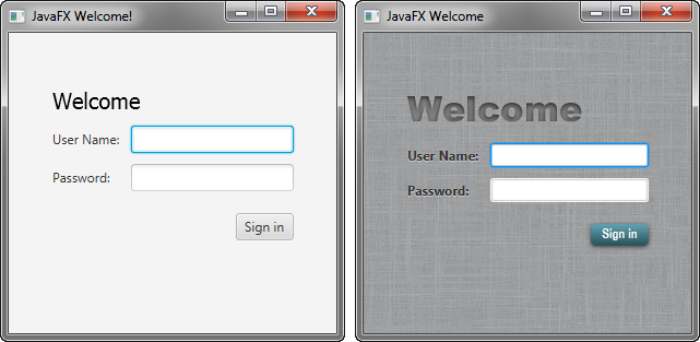 import javafx.application.Application; import javafx.event.ActionEvent; import javafx.event.EventHandler; import javafx.geometry.Insets; import javafx.geometry.Pos; import javafx.scene.Scene; import javafx.scene.control.Button; import javafx.scene.control.Label; import javafx.scene.control.PasswordField; import javafx.scene.control.TextField; import javafx.scene.layout.GridPane; import javafx.scene.layout.HBox; import javafx.scene.paint.Color; import javafx.scene.text.Font; import javafx.scene.text.FontWeight; import javafx.scene.text.Text; import javafx.stage.Stage; public class Login extends Application { public static void main(String[] args) { launch(args); } @Override public void start(Stage primaryStage) { primaryStage.setTitle("JavaFX Welcome"); GridPane grid = new GridPane(); grid.setAlignment(Pos.CENTER); grid.setHgap(10); grid.setVgap(10); grid.setPadding(new Insets(25, 25, 25, 25)); Text scenetitle = new Text("Welcome"); scenetitle.setId("welcome-text"); //scenetitle.setFont(Font.font("Tahoma", FontWeight.NORMAL, 20)); grid.add(scenetitle, 0, 0, 2, 1); Label userName = new Label("User Name:"); grid.add(userName, 0, 1); TextField userTextField = new TextField(); grid.add(userTextField, 1, 1); Label pw = new Label("Password:"); grid.add(pw, 0, 2); PasswordField pwBox = new PasswordField(); grid.add(pwBox, 1, 2); Button btn = new Button("Sign in"); HBox hbBtn = new HBox(10); hbBtn.setAlignment(Pos.BOTTOM_RIGHT); hbBtn.getChildren().add(btn); grid.add(hbBtn, 1, 4); final Text actiontarget = new Text(); grid.add(actiontarget, 1, 6); actiontarget.setId("actiontarget"); btn.setOnAction(new EventHandler<ActionEvent>() { @Override public void handle(ActionEvent e) { //actiontarget.setFill(Color.FIREBRICK); actiontarget.setText("Sign in button pressed"); } }); Scene scene = new Scene(grid, 300, 275); primaryStage.setScene(scene); scene.getStylesheets().add (Login.class.getResource("Login.css").toExternalForm()); primaryStage.show(); } }