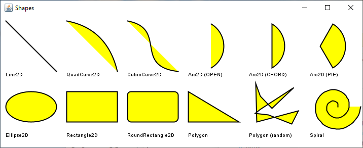 import java.awt.*; import java.awt.geom.*; import java.awt.font.*; import java.awt.image.*; /** A demonstration of Java2D shapes */ public class Shapes implements GraphicsExample { static final int WIDTH = 730, HEIGHT = 300; // Size of our example public String getName() {return "Shapes";} // From GraphicsExample public int getWidth() { return WIDTH; } // From GraphicsExample public int getHeight() { return HEIGHT; } // From GraphicsExample Shape[] shapes = new Shape[] { // A straight line segment new Line2D.Float(0, 0, 100, 100), // A quadratic bezier curve. Two end points and one control point new QuadCurve2D.Float(0, 0, 80, 15, 100, 100), // A cubic bezier curve. Two end points and two control points new CubicCurve2D.Float(0, 0, 80, 15, 10, 90, 100, 100), // A 120 degree portion of an ellipse new Arc2D.Float(-30, 0, 100, 100, 60, -120, Arc2D.OPEN), // A 120 degree portion of an ellipse, closed with a chord new Arc2D.Float(-30, 0, 100, 100, 60, -120, Arc2D.CHORD), // A 120 degree pie slice of an ellipse new Arc2D.Float(-30, 0, 100, 100, 60, -120, Arc2D.PIE), // An ellipse new Ellipse2D.Float(0, 20, 100, 60), // A rectangle new Rectangle2D.Float(0, 20, 100, 60), // A rectangle with rounded corners new RoundRectangle2D.Float(0, 20, 100, 60, 15, 15), // A triangle new Polygon(new int[] { 0, 0, 100 }, new int[] {20, 80, 80}, 3), // A random polygon, initialized in code below null, // A spiral: an instance of a custom Shape implementation new Spiral(50, 50, 5, 0, 50, 4*Math.PI), }; { // Initialize the null shape above as a Polygon with random points Polygon p = new Polygon(); for(int i = 0; i < 10; i++) p.addPoint((int)(100*Math.random()), (int)(100*Math.random())); shapes[10] = p; } // These are the labels for each of the shapes String[] labels = new String[] { "Line2D", "QuadCurve2D", "CubicCurve2D", "Arc2D (OPEN)", "Arc2D (CHORD)", "Arc2D (PIE)", "Ellipse2D", "Rectangle2D", "RoundRectangle2D", "Polygon", "Polygon (random)", "Spiral" }; /** Draw the example */ public void draw(Graphics2D g, Component c) { // Set basic drawing attributes g.setFont(new Font("SansSerif", Font.PLAIN, 10)); // select font g.setStroke(new BasicStroke(2.0f)); // 2 pixel lines g.setRenderingHint(RenderingHints.KEY_ANTIALIASING, // antialiasing RenderingHints.VALUE_ANTIALIAS_ON); g.translate(10, 10); // margins // Loop through each shape for(int i = 0; i < shapes.length; i++) { g.setColor(Color.yellow); // Set a color g.fill(shapes[i]); // Fill the shape with it g.setColor(Color.black); // Switch to black g.draw(shapes[i]); // Outline the shape with it g.drawString(labels[i], 0, 110); // Label the shape g.translate(120, 0); // Move over for next shape if (i % 6 == 5) g.translate(-6*120, 120); // Move down after 6 } } } /* * Copyright (c) 2004 David Flanagan. All rights reserved. * This code is from the book Java Examples in a Nutshell, 3nd Edition. * It is provided AS-IS, WITHOUT ANY WARRANTY either expressed or implied. * You may study, use, and modify it for any non-commercial purpose, * including teaching and use in open-source projects. * You may distribute it non-commercially as long as you retain this notice. * For a commercial use license, or to purchase the book, * please visit http://www.davidflanagan.com/javaexamples3. */