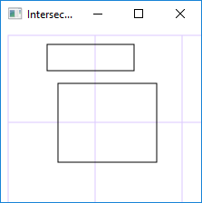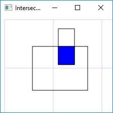 import javafx.application.Application; import javafx.stage.Stage; import javafx.scene.Group; //import javafx.scene.Cursor; import javafx.scene.*; import javafx.event.EventHandler; import javafx.scene.paint.*; import javafx.scene.shape.*; import javafx.collections.*; import javafx.geometry.Point2D; import javafx.geometry.Bounds; import javafx.scene.input.* ; import javafx.scene.layout.Pane; import java.lang.Math; import javafx.scene.control.Button; import javafx.event.ActionEvent; import javafx.scene.layout.BorderPane; import javafx.scene.layout.HBox; import java.util.ArrayList; public class Intersect extends Application { Group grp = new Group(); double xs; double ys; double xe; double ye; Rectangle r; Rectangle r1=null; Rectangle r2=null; Rectangle r3=null; myRect ra, rb; public void start(Stage stage) { // Create a border pane BorderPane pane = new BorderPane(); Scene scene = new Scene(pane, 400, 400); Pane mypane = new Pane(); pane.setCenter(mypane); mypane.getChildren().add(grp); grp.setTranslateX(scene.getWidth()/2); grp.setTranslateY(scene.getHeight()/2); double res = 96; grp.setScaleX(res); grp.setScaleY(res); int N = 2; Grid.draw(grp,N); stage.setTitle("Intersecting Rectangles"); stage.setScene(scene); stage.show(); grp.setOnMousePressed( e -> { xs = e.getX(); ys = e.getY(); if (r1!=null) r1.setFill(Color.TRANSPARENT); r = new Rectangle(xs,ys,0,0); r.setStroke(Color.BLACK); r.setStrokeWidth(1/res); r.setStrokeLineCap(StrokeLineCap.ROUND); r.setFill(Color.TRANSPARENT); grp.getChildren().add(r); grp.getChildren().remove(r2); grp.getChildren().remove(r3); r3 = null; } ); grp.setOnMouseDragged( e -> { xe = e.getX(); ye = e.getY(); double width = xe - xs; if (width>0) r.setX(xs); else r.setX(xe); r.setWidth(Math.abs(width)); double height = ye-ys; if (height>0) r.setY(ys); else r.setY(ye); r.setHeight(Math.abs(height)); } ); grp.setOnMouseReleased( e -> { if (r1==null) r1 = r; else r2 = r; if (r2==null) return; ra = new myRect(r1); rb = new myRect(r2); r3 = myRect.intersection(ra,rb); if (ra.contains(rb)) { r2.setFill(Color.RED); } else if (rb.contains(ra)) { r1.setFill(Color.RED); } else if (r3!=null) { r3.setStrokeWidth(1/res); r3.setStrokeLineCap(StrokeLineCap.ROUND); r3.setStroke(Color.BLACK); r3.setFill(Color.BLUE); grp.getChildren().add(r3); } } ); } public static void main(String[] args) { launch(args); } } class myRect { double xmin,ymin,xmax,ymax; myRect(Rectangle r) { xmin=r.getX(); ymin=r.getY(); xmax = xmin + r.getWidth(); ymax = ymin + r.getHeight(); } public boolean contains(myRect r) { if (r.xmin<xmin) return false; if (r.xmax>xmax) return false; if (r.ymin<ymin) return false; if (r.ymax>ymax) return false; return true; } static public Rectangle intersection(myRect a, myRect b) { if (a.xmin > b.xmax) return null; if (a.xmax < b.xmin) return null; if (a.ymin > b.ymax) return null; if (a.ymax < b.ymin) return null; double x1 = Math.max(a.xmin,b.xmin); double y1 = Math.max(a.ymin,b.ymin); double x2 = Math.min(a.xmax,b.xmax); double y2 = Math.min(a.ymax,b.ymax); return new Rectangle(x1,y1,x2-x1,y2-y1); } }