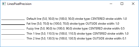 import javafx.application.Application; import javafx.scene.Scene; import javafx.scene.layout.Pane; import javafx.scene.paint.Color; import javafx.scene.shape.Line; import javafx.scene.shape.StrokeType; import javafx.scene.text.Text; import javafx.stage.Stage; /** * A JavaFX Example of lines drawn showing pixels width * when using fractional points and stroke widths. * @author carldea */ public class LinesPixelPrecision extends Application { /** * @param args the command line arguments */ public static void main(String[] args) { Application.launch(args); } @Override public void start(Stage stage) { stage.setTitle("LinesPixelPrecision "); Pane root = new Pane(); Scene scene = new Scene(root, 800, 250, Color.WHITE); double y = 50.0; // draw a line using default values Line defaultLine = createLine(5.0, y, 100, y, 1, null); Text defaultLineText = createText(defaultLine, "Default"); y = 70; Line fatLine = createLine(5.0, y, 100, y, 1, StrokeType.OUTSIDE); Text fatLineText = createText(fatLine, "Fat"); y = 90; Line fuzzyLine = createLine(5.0, y, 100, y, .5, null); Text fuzzyLineText = createText(fuzzyLine, "Fuzzy"); y = 110.5; Line thin1Line = createLine(5.0, y, 100, y, 1, null); Text thin1LineText = createText(thin1Line, "Thin 1"); y = 130.5; Pane subPane = new Pane(); Line thin2Line = createLine(5.0, y, 100, y, 0.10, StrokeType.OUTSIDE); subPane.getChildren().add(thin2Line); Text thin2LineText = createText(thin2Line, "Thin 2"); root.getChildren().addAll(defaultLine, defaultLineText); root.getChildren().addAll(fatLine, fatLineText); root.getChildren().addAll(fuzzyLine, fuzzyLineText); root.getChildren().addAll(thin1Line, thin1LineText); root.getChildren().addAll(subPane, thin2LineText); stage.setScene(scene); stage.show(); } private Line createLine(double startX, double startY, double endX, double endY, double strokeWidth, StrokeType strokeType) { Line line = new Line(startX, startY, endX, endY); line.setStrokeWidth(strokeWidth); if (strokeType != null) { line.setStrokeType(strokeType); } line.setStroke(Color.BLACK); return line; } private Text createText(Line line, String name) { // label line (%s, %s) to (%s, %s) stroke type: %s String displayString = String.format(" %s line (%s, %s) to (%s, %s) stroke type: %s stroke width: %s", name, line.getStartX(), line.getStartY(), line.getEndX(), line.getEndY(), line.getStrokeType().toString(), line.getStrokeWidth()); Text text = new Text(displayString); text.setX( line.getEndX() + 5); text.setY( line.getEndY()); text.setFill(Color.BLACK); return text; } }