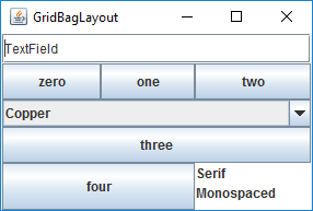 // Fig. 22.23-24: GridBagDemo2.java // Demonstrating GridBagLayout constants. import java.awt.GridBagLayout; import java.awt.GridBagConstraints; import java.awt.Component; import javax.swing.JFrame; import javax.swing.JComboBox; import javax.swing.JTextField; import javax.swing.JList; import javax.swing.JButton; class GridBagFrame2 extends JFrame { private final GridBagLayout layout; // layout of this frame private final GridBagConstraints constraints; // layout's constraints // set up GUI public GridBagFrame2() { super("GridBagLayout"); layout = new GridBagLayout(); setLayout(layout); constraints = new GridBagConstraints(); // instantiate constraints // create GUI components String[] metals = {"Copper", "Aluminum", "Silver"}; JComboBox<String> comboBox = new JComboBox<String>(metals); JTextField textField = new JTextField("TextField"); String[] fonts = {"Serif", "Monospaced"}; JList list = new JList(fonts); String[] names = {"zero", "one", "two", "three", "four"}; JButton[] buttons = new JButton[names.length]; for (int count = 0; count < buttons.length; count++) buttons[count] = new JButton(names[count]); // define GUI component constraints for textField constraints.weightx = 1; constraints.weighty = 1; constraints.fill = GridBagConstraints.BOTH; constraints.gridwidth = GridBagConstraints.REMAINDER; addComponent(textField); // buttons[0] -- weightx and weighty are 1: fill is BOTH constraints.gridwidth = 1; addComponent(buttons[0]); // buttons[1] -- weightx and weighty are 1: fill is BOTH constraints.gridwidth = GridBagConstraints.RELATIVE; addComponent(buttons[1]); // buttons[2] -- weightx and weighty are 1: fill is BOTH constraints.gridwidth = GridBagConstraints.REMAINDER; addComponent(buttons[2]); // comboBox -- weightx is 1: fill is BOTH constraints.weighty = 0; constraints.gridwidth = GridBagConstraints.REMAINDER; addComponent(comboBox); // buttons[3] -- weightx is 1: fill is BOTH constraints.weighty = 1; constraints.gridwidth = GridBagConstraints.REMAINDER; addComponent(buttons[3]); // buttons[4] -- weightx and weighty are 1: fill is BOTH constraints.gridwidth = GridBagConstraints.RELATIVE; addComponent(buttons[4]); // list -- weightx and weighty are 1: fill is BOTH constraints.gridwidth = GridBagConstraints.REMAINDER; addComponent(list); } // end GridBagFrame2 constructor // add a component to the container private void addComponent(Component component) { layout.setConstraints(component, constraints); add(component); // add component } } // end class GridBagFrame2 public class GridBagDemo2 { public static void main(String[] args) { GridBagFrame2 gridBagFrame = new GridBagFrame2(); gridBagFrame.setDefaultCloseOperation(JFrame.EXIT_ON_CLOSE); gridBagFrame.setSize(300, 200); gridBagFrame.setVisible(true); } } // end class GridBagDemo2