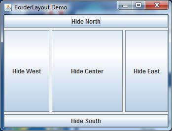 // Fig. 14.42: BorderLayoutDemo.java // Testing BorderLayoutFrame. import javax.swing.JFrame; import java.awt.BorderLayout; import java.awt.event.ActionListener; import java.awt.event.ActionEvent; import javax.swing.JButton; class BorderLayoutFrame extends JFrame implements ActionListener { private JButton[] buttons; // array of buttons to hide portions private static final String[] names = { "Hide North", "Hide South", "Hide East", "Hide West", "Hide Center" }; private BorderLayout layout; // borderlayout object // set up GUI and event handling public BorderLayoutFrame() { super( "BorderLayout Demo" ); layout = new BorderLayout( 5, 5 ); // 5 pixel gaps setLayout( layout ); // set frame layout buttons = new JButton[ names.length ]; // set size of array // create JButtons and register listeners for them for ( int count = 0; count < names.length; count++ ) { buttons[ count ] = new JButton( names[ count ] ); buttons[ count ].addActionListener( this ); } // end for add( buttons[ 0 ], BorderLayout.NORTH ); // add button to north add( buttons[ 1 ], BorderLayout.SOUTH ); // add button to south add( buttons[ 2 ], BorderLayout.EAST ); // add button to east add( buttons[ 3 ], BorderLayout.WEST ); // add button to west add( buttons[ 4 ], BorderLayout.CENTER ); // add button to center } // end BorderLayoutFrame constructor // handle button events public void actionPerformed( ActionEvent event ) { // check event source and lay out content pane correspondingly for ( JButton button : buttons ) { if ( event.getSource() == button ) button.setVisible( false ); // hide button clicked else button.setVisible( true ); // show other buttons } // end for layout.layoutContainer( getContentPane() ); // lay out content pane } // end method actionPerformed } // end class BorderLayoutFrame public class BorderLayoutDemo { public static void main( String[] args ) { BorderLayoutFrame borderLayoutFrame = new BorderLayoutFrame(); borderLayoutFrame.setDefaultCloseOperation( JFrame.EXIT_ON_CLOSE ); borderLayoutFrame.setSize( 300, 200 ); // set frame size borderLayoutFrame.setVisible( true ); // display frame } // end main } // end class BorderLayoutDemo