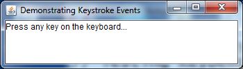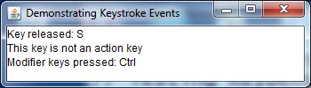 // Fig. 14.37: KeyDemo.java // Testing KeyDemoFrame. import java.awt.Color; import java.awt.event.KeyListener; import java.awt.event.KeyEvent; import javax.swing.JFrame; import javax.swing.JTextArea; class KeyDemoFrame extends JFrame implements KeyListener { private String line1 = ""; // first line of textarea private String line2 = ""; // second line of textarea private String line3 = ""; // third line of textarea private JTextArea textArea; // textarea to display output // KeyDemoFrame constructor public KeyDemoFrame() { super( "Demonstrating Keystroke Events" ); textArea = new JTextArea( 10, 15 ); // set up JTextArea textArea.setText( "Press any key on the keyboard..." ); textArea.setEnabled( false ); // disable textarea textArea.setDisabledTextColor( Color.BLACK ); // set text color add( textArea ); // add textarea to JFrame addKeyListener( this ); // allow frame to process key events } // end KeyDemoFrame constructor // handle press of any key public void keyPressed( KeyEvent event ) { line1 = String.format( "Key pressed: %s", KeyEvent.getKeyText( event.getKeyCode() ) ); // show pressed key setLines2and3( event ); // set output lines two and three } // end method keyPressed // handle release of any key public void keyReleased( KeyEvent event ) { line1 = String.format( "Key released: %s", KeyEvent.getKeyText( event.getKeyCode() ) ); // show released key setLines2and3( event ); // set output lines two and three } // end method keyReleased // handle press of an action key public void keyTyped( KeyEvent event ) { line1 = String.format( "Key typed: %s", event.getKeyChar() ); setLines2and3( event ); // set output lines two and three } // end method keyTyped // set second and third lines of output private void setLines2and3( KeyEvent event ) { line2 = String.format( "This key is %san action key", ( event.isActionKey() ? "" : "not " ) ); String temp = KeyEvent.getKeyModifiersText( event.getModifiers() ); line3 = String.format( "Modifier keys pressed: %s", ( temp.equals( "" ) ? "none" : temp ) ); // output modifiers textArea.setText( String.format( "%s\n%s\n%s\n", line1, line2, line3 ) ); // output three lines of text } // end method setLines2and3 } // end class KeyDemoFrame public class KeyDemo { public static void main( String[] args ) { KeyDemoFrame keyDemoFrame = new KeyDemoFrame(); keyDemoFrame.setDefaultCloseOperation( JFrame.EXIT_ON_CLOSE ); keyDemoFrame.setSize( 350, 100 ); // set frame size keyDemoFrame.setVisible( true ); // display frame } // end main } // end class KeyDemo