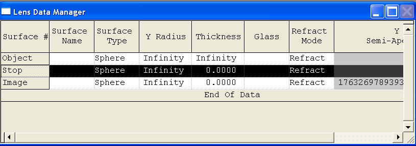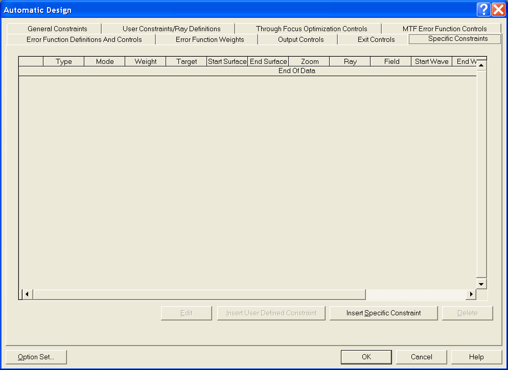 This clears out any previous lens data and prepares CODE V to define a new lens. A new lens "wizard" may be used to enter system design specifications, but let us suppose that we choose not to use the wizard. Instead, we enter the system data using the standard CODE V dialog boxes.