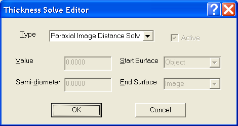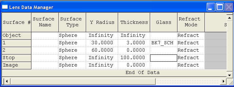 You may have noticed that the value of 100 mm was not a very good guess for the distance from surface 3 to the image. We could try various values to achieve better focus, but there's an easier way. The paraxial image solve can set the focal distance directly, without trial and error.