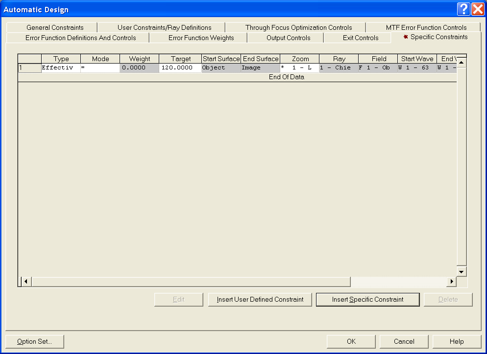 This produces a default optimization that holds the system's effective focal length (EFL) to its target value. It generates a grid of rays from each object point and wavelength, and tries to minimize the RMS spot size of these ray bundles. It does this by changing the variables, while meeting any required constraints.