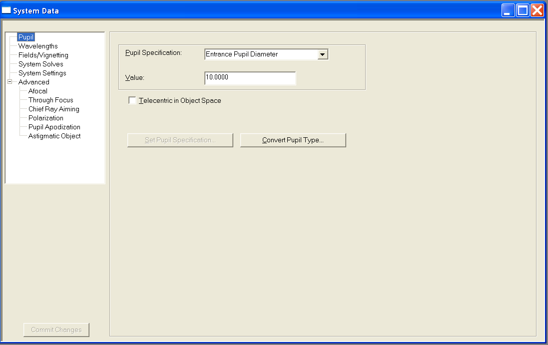 CODE V needs to know the system aperture (or pupil size) of your system. This can be entered in one of four ways, entrance pupil diameter, numerical aperture at the object or image, or image space f/number; one of these must be entered, since there is no default pupil specifcation. The pupil specification defines the extent of the light bundles traced from each field point.