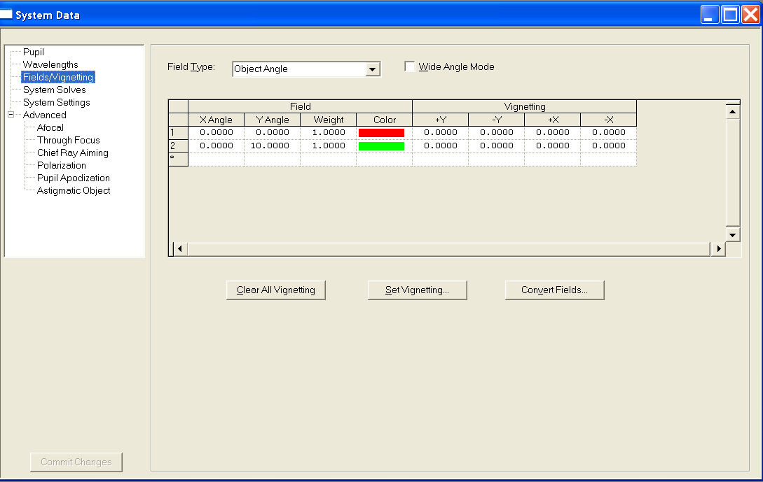 Field angles should be entered in increasing order and should be entered as a Y-Angle for symmetric optical systems.