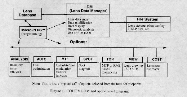 In addition to its role as a data editor or database manager, the LDM also serves as the top level or "home base" for running CODE V. As shown in the diagram below, CODE V has two basic levels, the LDM and the Options. When you enter CODE V, you start out in the LDM, and from here you can create a lens, restore one from a file, modify it, etc. After a lens is defined, you can run any of the Options, launching the option from the LDM (by typing the name of the option in command mode, or by choosing the option from a menu in screens).