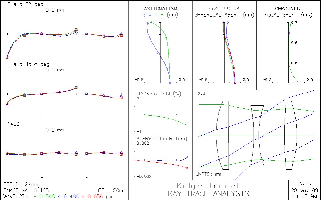APERTURE Entrance beam radius: * 6.250000 Image axial ray slope: -0.125015 Object num. aperture: 6.2500e-20 F-number: 3.999519 Image num. aperture: 0.125015 Working F-number: 3.999519 FIELD Field angle: * 22.000000 Object height: -4.0403e+19 Gaussian image height: 20.198883 Chief ray ims height: 20.105174 CONJUGATES Object distance: 1.0000e+20 Srf 1 to prin. pt. 1: 10.142043 Gaussian image dist.: 41.830791 Srf 7 to prin. pt. 2: -8.163199 Overall lens length: 16.371000 Total track length: 1.0000e+20 Paraxial magnification: -4.9994e-19 Srf 7 to image srf: 41.605240 OTHER DATA Entrance pupil radius: 6.250000 Srf 1 to entrance pup.: 11.557909 Exit pupil radius: 6.077870 Srf 7 to exit pupil: -6.786327 Lagrange invariant: -2.525164 Petzval radius: -113.737979 Effective focal length: 49.993991 SPOT DIAGRAMS Aperture divisions: 17.030000 Gaussian apod. spec.: Off X 1/e^2 entr. irrad.: 1.000000 Y 1/e^2 entr. irrad.: 1.000000