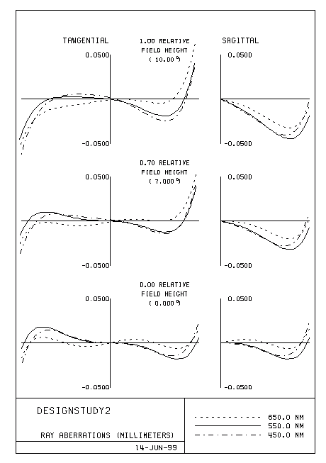 Designstudy2 RDY THI RMD GLA CCY THC GLC > OBJ: INFINITY INFINITY 100 100 1: 38.06431 5.000000 SK16_SCHOTT 0 100 2: 240.41416 13.894762 0 0 STO: -52.90933 1.250000 F4_SCHOTT 0 100 4: 33.96810 9.705481 0 0 5: 85.59492 5.000000 SK16_SCHOTT 0 100 6: -41.69665 84.522465 0 PIM IMG: INFINITY 0.000000 100 100 SPECIFICATION DATA FNO 4.00000 NFO 5 FFO -1.00000 IFO 0.50000 DIM MM WL 650.00 550.00 450.00 REF 2 WTW 1 1 1 XAN 0.00000 0.00000 0.00000 YAN 0.00000 7.00000 10.00000 VUY 0.00000 0.00000 0.00000 VLY 0.00000 0.00000 0.00000 APERTURE DATA/EDGE DEFINITIONS CA APERTURE data not specified for surface Obj thru 7 REFRACTIVE INDICES GLASS CODE 650.00 550.00 450.00 SK16_SCHOTT 1.617521 1.622608 1.631356 F4_SCHOTT 1.612031 1.620161 1.635120 SOLVES PIM No pickups defined in system INFINITE CONJUGATES EFL 100.0000 BFL 84.5225 FFL -74.6102 FNO 4.0000 IMG DIS 84.5225 OAL 34.8502 PARAXIAL IMAGE HT 17.6327 ANG 10.0000 ENTRANCE PUPIL DIA 25.0000 THI 22.5872 EXIT PUPIL DIA 25.7209 THI -18.3610