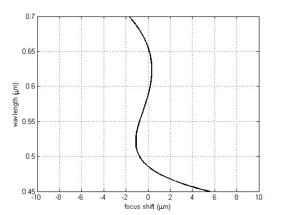 wvln = linspace(0.45,0.7,201); dz = zeros(size(wvln)); for k=1:length(wvln) phi = 0.0; for m=1:3 rn = sellmeier(glass.disperse(idx(m),:),wvln(k)); phi = phi + (rn-1)*cvd(m); end dz(k) = 1/phi - 50; end plot(dz*1e3,wvln,'k','LineWidth',2); axis([-10 10 0.45 0.7]); grid xlabel('focus shift (\mum)'); ylabel('wavlength (\mum)');