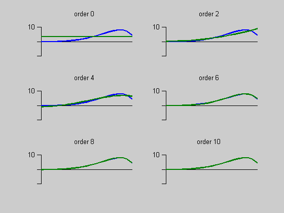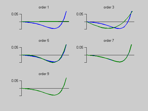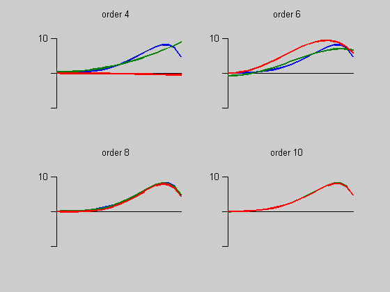 % show differences for k=1:4 subplot(2,2,k); n = k+1; c = table(n,1:n)'; y1 = yfit(:,1:n)*c; c = [0; otable(k,1:k)']; y2 = yfit(:,1:k+1)*c; fanplot(y,[opd y1 y2],10); title(sprintf('order %d',2*k+2)); end
