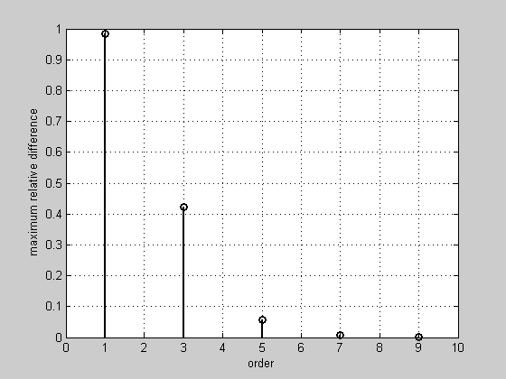 close all; order = 1:2:9; qual = zeros(size(order)); ref = max(abs(dy)); for k=1:length(order) c = rtable(k,1:k)'; yf = yfit(:,1:k)*c; diff = dy - yf; qual(k) = max(abs(diff))/ref; end stem(order,qual,'k','LineWidth',2); grid; xlabel('order'); ylabel('maximum relative difference'); axis([0 10 0 1]);