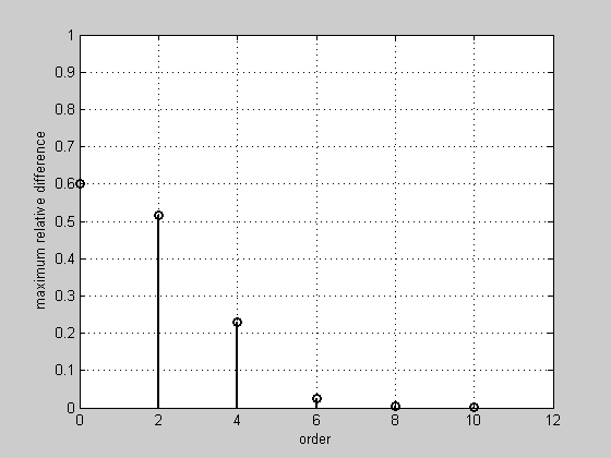 close all; order = 0:2:10; qual = zeros(size(order)); ref = max(abs(opd)); for k=1:length(order) c = table(k,1:k)'; yf = yfit(:,1:k)*c; diff = opd - yf; qual(k) = max(abs(diff))/ref; end stem(order,qual,'k','LineWidth',2); grid; xlabel('order'); ylabel('maximum relative difference'); axis([0 12 0 1]);