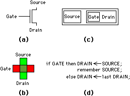 The topology of a circuit is its structure, or connectivity that describes the physical parts. Figures 1.18 and 1.19 illustrate a few topological views, the exceptions being Figs. 1.18(d) and 1.19(d), which are behavioral and temporal descriptions. Each view captures some essential abstraction of the circuit. The most abstract form is the architecture view, in which machine components such as processors and memories interconnect. Lower than that is the component view, in which datapaths and registers connect. This is often used to describe a complete hardware design without giving trivial detail. Below this, the gate view shows all necessary components without precise placement or size. At the bottom, there are layout or mask views that show all the geometry that will be manufactured. Chapter 2 describes these topological views and shows that their ordering is not able to be precisely specified. In fact, there are many other ways to consider the ordering of circuit views [Brown, Tong, and Foyster]. Nevertheless, all these views form a hierarchy in which the more abstract representations are higher than are the more detailed descriptions.