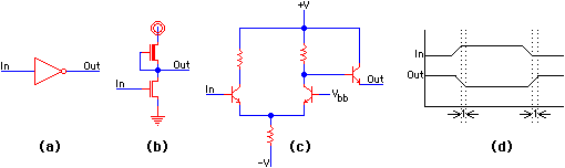 FIGURE 1.19 Multiple views for an inverter: (a) Schematic (b) nMOS (c) Bipolar (d) Temporal. |