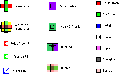 A technology in Electric is an object that aggregates node, port, and arc prototypes to describe a particular design environment. For example, the nMOS technology object has three arc prototypes for metal, polysilicon, and diffusion wires. It has node prototypes for enhancement and depletion transistors in addition to a series of node prototypes for interwire connections (butting, buried, and cut contacts) and intrawire connections, or pins. Instances of these prototypes can be assembled into an nMOS circuit (much like in Figs. 2.18 and 2.19). Since technologies are objects, they can also hold additional attributes. Initially, the added information includes design-rule tables and shape descriptions, but more could be handled; for example, one could add an attribute called "toxicity-level," which contains a paragraph of text describing the environmental ramifications of this semiconductor fabrication process.