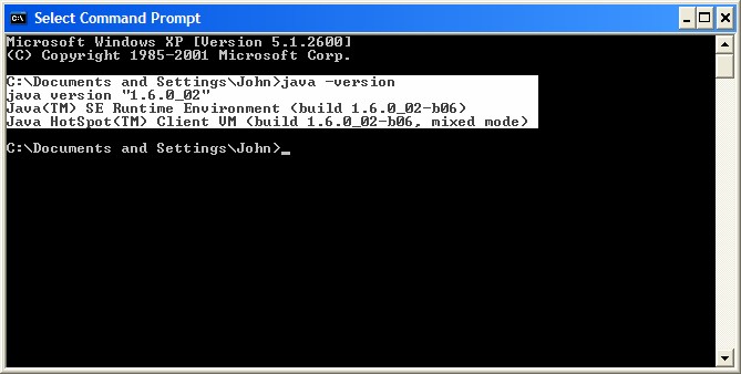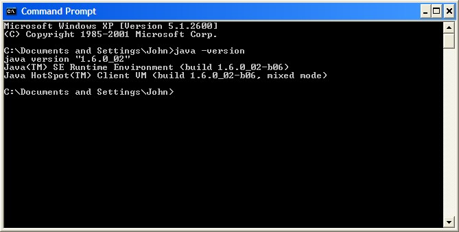 C:\Documents and Settings\John>java -version java version "1.6.0_02" Java(TM) SE Runtime Environment (build 1.6.0_02-b06) Java HotSpot(TM) Client VM (build 1.6.0_02-b06, mixed mode)