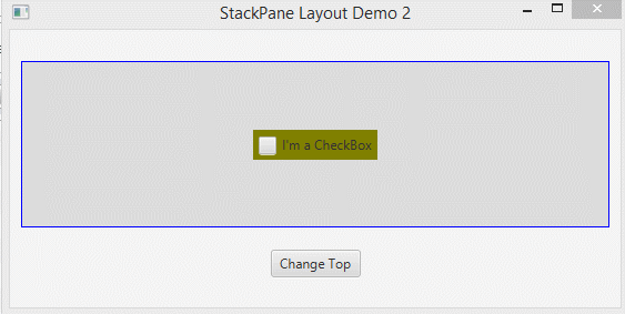 import javafx.application.Application; import javafx.collections.ObservableList; import javafx.event.ActionEvent; import javafx.event.EventHandler; import javafx.geometry.Insets; import javafx.geometry.Pos; import javafx.scene.Node; import javafx.scene.Scene; import javafx.scene.control.Button; import javafx.scene.control.CheckBox; import javafx.scene.control.Label; import javafx.scene.layout.StackPane; import javafx.scene.layout.VBox; import javafx.stage.Stage; public class StackPaneDemo2 extends Application { private StackPane stackPane; @Override public void start(Stage primaryStage) throws Exception { VBox root = new VBox(); // StackPane stackPane = new StackPane(); // Add Label to StackPane Label label = new Label("I'm a Label"); label.setStyle("-fx-background-color:yellow"); label.setPadding(new Insets(5,5,5,5)); // Hide this label. label.setVisible(false); stackPane.getChildren().add(label); // Add Button to StackPane Button button = new Button("I'm a Button"); button.setStyle("-fx-background-color: cyan"); button.setPadding(new Insets(5,5,5,5)); // Hide this button. button.setVisible(false); stackPane.getChildren().add(button); // Add CheckBox to StackPane CheckBox checkBox = new CheckBox("I'm a CheckBox"); checkBox.setOpacity(1); checkBox.setStyle("-fx-background-color:olive"); checkBox.setPadding(new Insets(5,5,5,5)); // Show this checkBox (default). checkBox.setVisible(true); stackPane.getChildren().add(checkBox); // stackPane.setPrefSize(300, 150); stackPane.setStyle("-fx-background-color: Gainsboro;-fx-border-color: blue;"); // root.getChildren().add(stackPane); Button controlButton = new Button("Change Top"); root.getChildren().add(controlButton); root.setAlignment(Pos.CENTER); VBox.setMargin(stackPane, new Insets(10, 10, 10, 10)); VBox.setMargin(controlButton, new Insets(10, 10, 10, 10)); // Scene scene = new Scene(root, 550, 250); primaryStage.setTitle("StackPane Layout Demo 2"); primaryStage.setScene(scene); controlButton.setOnAction(new EventHandler<ActionEvent>() { @Override public void handle(ActionEvent event) { changeTop(); } }); primaryStage.show(); } private void changeTop() { ObservableList<Node> childs = this.stackPane.getChildren(); if (childs.size() > 1) { // Node topNode = childs.get(childs.size()-1); // This node will be brought to the front Node newTopNode = childs.get(childs.size()-2); topNode.setVisible(false); topNode.toBack(); newTopNode.setVisible(true); } } public static void main(String[] args) { launch(args); } }