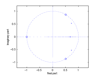 z = [-1 exp(1.0376j) exp(-1.0376j)]'; p = [0.683 0.892*exp(0.6257j) 0.892*exp(-0.6257j)]'; k = 0.05634;The pole-zero plot for this example is given by