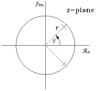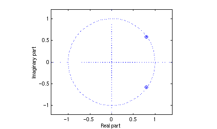 Another slight generalization of the reson is to place a pair of zeros near the poles along the same direction as the poles. The poles are a distance ra from the origin and the zeros at a distance rb. In the figure below the zeros and poles are very close together and very close to the unit circle.