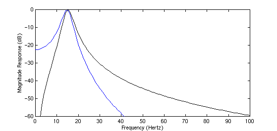 Add a zero at +1 to suppress the DC gain. This improves the low-frequency fall-off at the expense of the high-frequency fall-off. This example is centered at 15 Hz with a bandwidth of 5 Hz, sampled at 8 kHz. The blue curve shows the response without the zero, and the black curve shows the response with the zero.