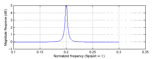 >> ra = 0.995 >> rb = 0.990 >> theta = 2*pi/10; >> b = [1 -2*rb*cos(theta) rb*rb]; >> a = [1 -2*ra*cos(theta) ra*ra]; >> w = linspace(0.1,0.3,100); >> freqz(b,a,w*pi); % boost filter >> freqz(a,b,w*pi); % notch filter