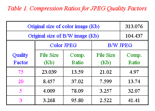The color images achieve better compression ratios, but still produce bigger compressed files. Although image appearance is subjective, the black and white image seems to withstand higher compression, and still look fine; a quality factor of three show this fairly well.