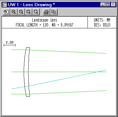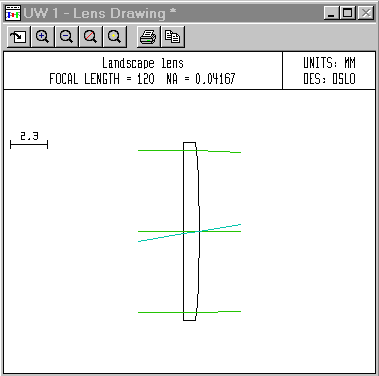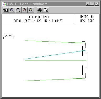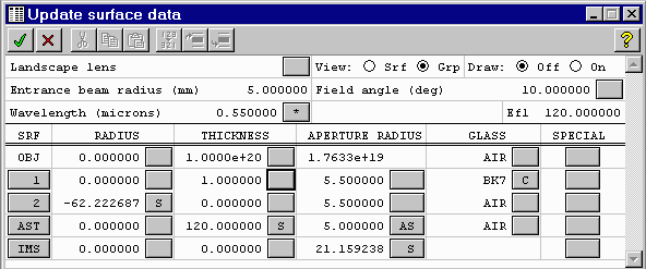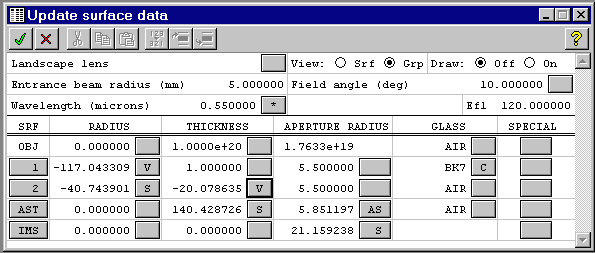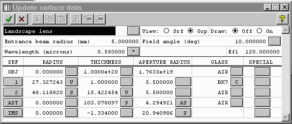 In our first attempt, the optimization converged to a front landscape lens. Suppose that we want a back landscape lens. We can manually change the distance to the stop to a positive number (say 20) and re-optimize. However, the program returned to approximately the original solution. We try again. Change the radius of the first surface to 120 and the distance to the stop to 20, which effectively flips the lens. An iteration cycle now finds the desired solution: