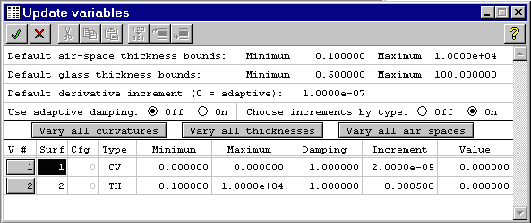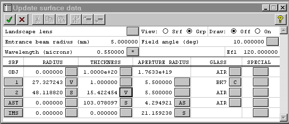 Use the menu choice Optimize - GENII Error function to select a generic merit function. Use the menu choice Optimize - Variables to generate a list of variables. Vary the curvature of surface 1 and the thickness of surface 2. You may also set variables using the buttons next to the entries of the surface data table.