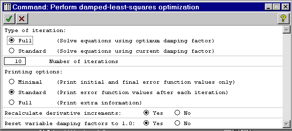 Once the variables and merit function are defined, the Optimize - Iterate. menu entry becomes active. It brings up the iteration dialog below.