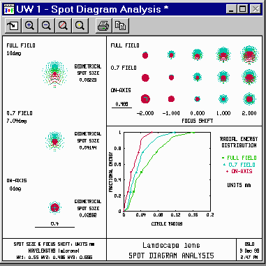 Finally a spot diagram analysis (with a maximum focus shift of 2 mm) gives the following results: