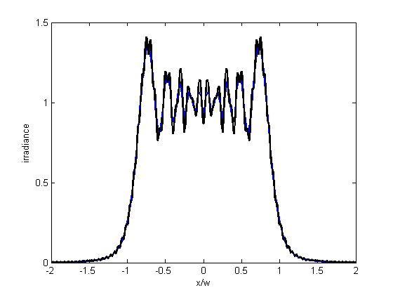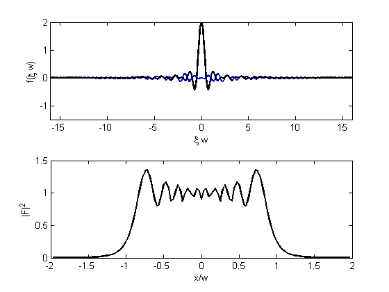 N=1024; D=32; invNf=0; k=-N/2:N/2-1; x = (1/D)*k; dx = x(2)-x(1); g = rect(x/2); gf = fftshift(fft(fftshift(g)))*dx; f = gf.*qchirp(fx,-invNf); z = fftshift(ifft(fftshift(f)))*dx*N; x = (D/N)*k; y = z.*conj(z); xrange=2; idx = find(abs(x)<xrange); plot(x(idx),y(idx),'k','LineWidth',1.5); axis([-xrange xrange 0 1.2]); xlabel('x/w'); ylabel('irradiance');