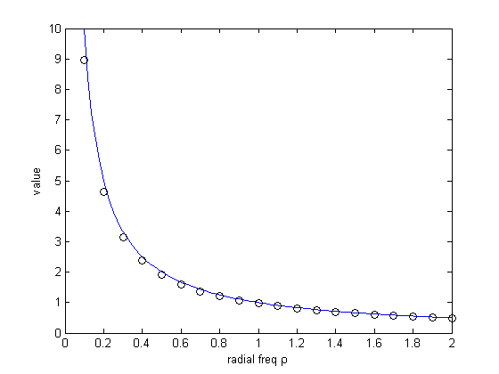 g = zeros(size(rho)); for k=1:length(rho) % use quadl (recursive adaptive Lobatto quadrature) g(k) = 2*pi*quadl(hankel1,0,50,[],[],rho(k)); end u = linspace(0.1,2,101); v = 1./u; plot(u,v,rho,g,'ko'); xlabel('radial freq \rho'); ylabel('value');