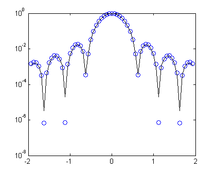 xf = (-N/2:N/2-1)/D; y = somb(2*xf).^2; semilogy(xf(idx),z(ndx,idx),'o',xf(idx),y(idx),'k');