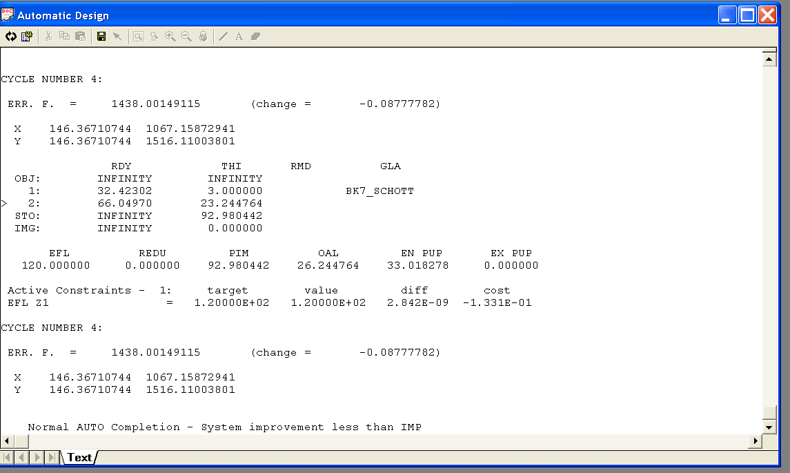 This produces a default optimization that holds the system's effective focal length (EFL) to its target value. It generates a grid of rays from each object point and wavelength, and tries to minimize the RMS spot size of these ray bundles. It does this by changing the variables, while meeting any required constraints.