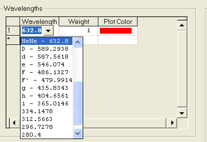 You may add or delete wavelengths from the list. Double-click the wavelength box to bring up a list of possible wavelength choices. You can change the weight and plot color associated with each wavelength as well.