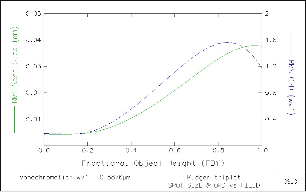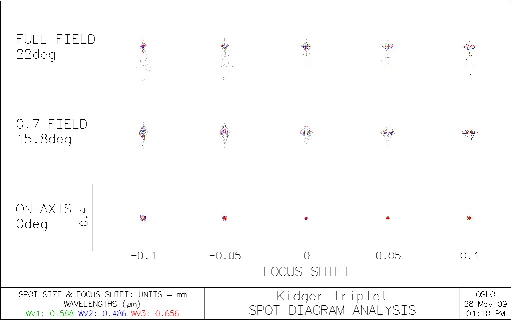 APERTURE Entrance beam radius: * 6.250000 Image axial ray slope: -0.125015 Object num. aperture: 6.2500e-20 F-number: 3.999519 Image num. aperture: 0.125015 Working F-number: 3.999519 FIELD Field angle: * 22.000000 Object height: -4.0403e+19 Gaussian image height: 20.198883 Chief ray ims height: 20.105174 CONJUGATES Object distance: 1.0000e+20 Srf 1 to prin. pt. 1: 10.142043 Gaussian image dist.: 41.830791 Srf 7 to prin. pt. 2: -8.163199 Overall lens length: 16.371000 Total track length: 1.0000e+20 Paraxial magnification: -4.9994e-19 Srf 7 to image srf: 41.605240 OTHER DATA Entrance pupil radius: 6.250000 Srf 1 to entrance pup.: 11.557909 Exit pupil radius: 6.077870 Srf 7 to exit pupil: -6.786327 Lagrange invariant: -2.525164 Petzval radius: -113.737979 Effective focal length: 49.993991 SPOT DIAGRAMS Aperture divisions: 17.030000 Gaussian apod. spec.: Off X 1/e^2 entr. irrad.: 1.000000 Y 1/e^2 entr. irrad.: 1.000000